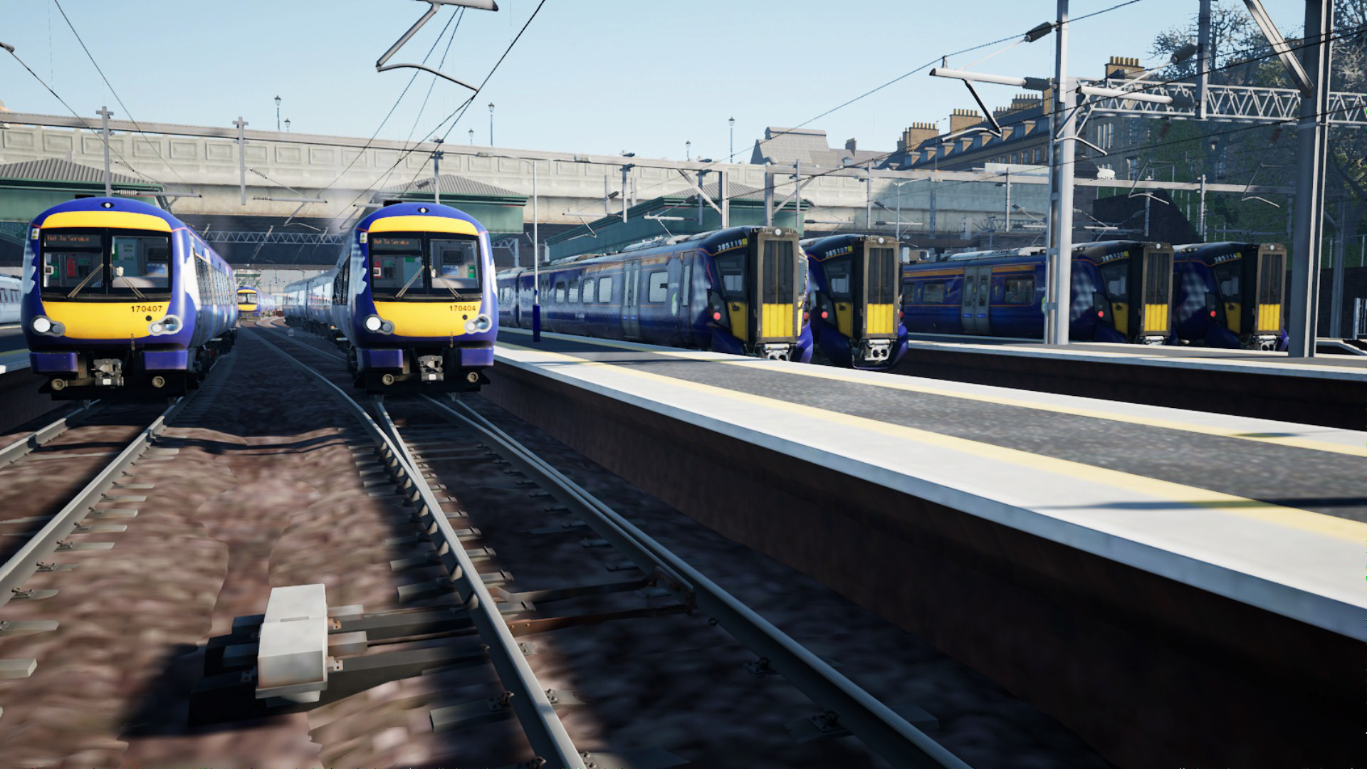 Train line up of 170s and 385s at Edinburgh Waverley.