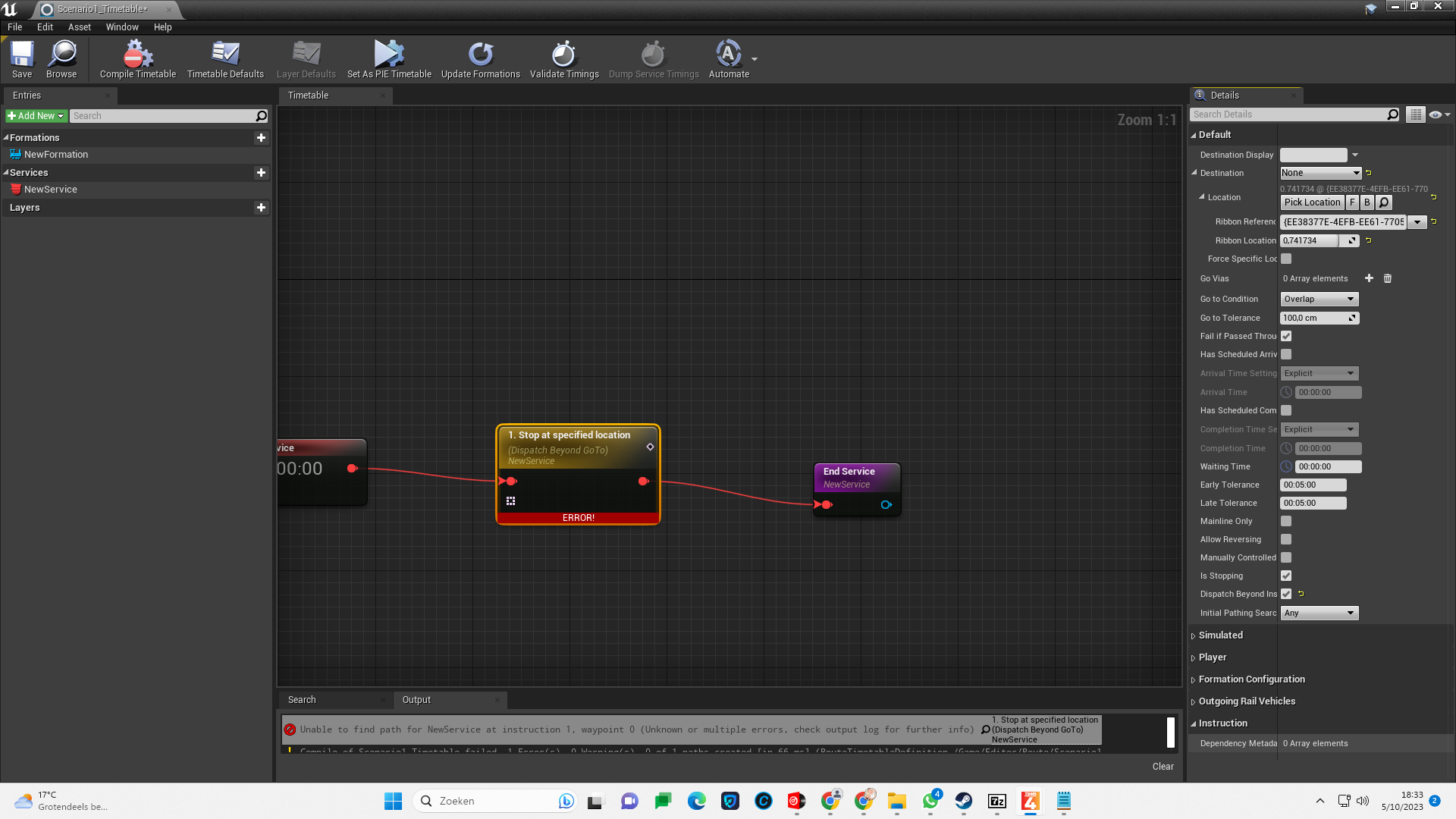 Unable to find path for NewService at instruction 1, waypoint 0 (Unknown or multiple errors, check output log for further info) 1. Stop at specified
